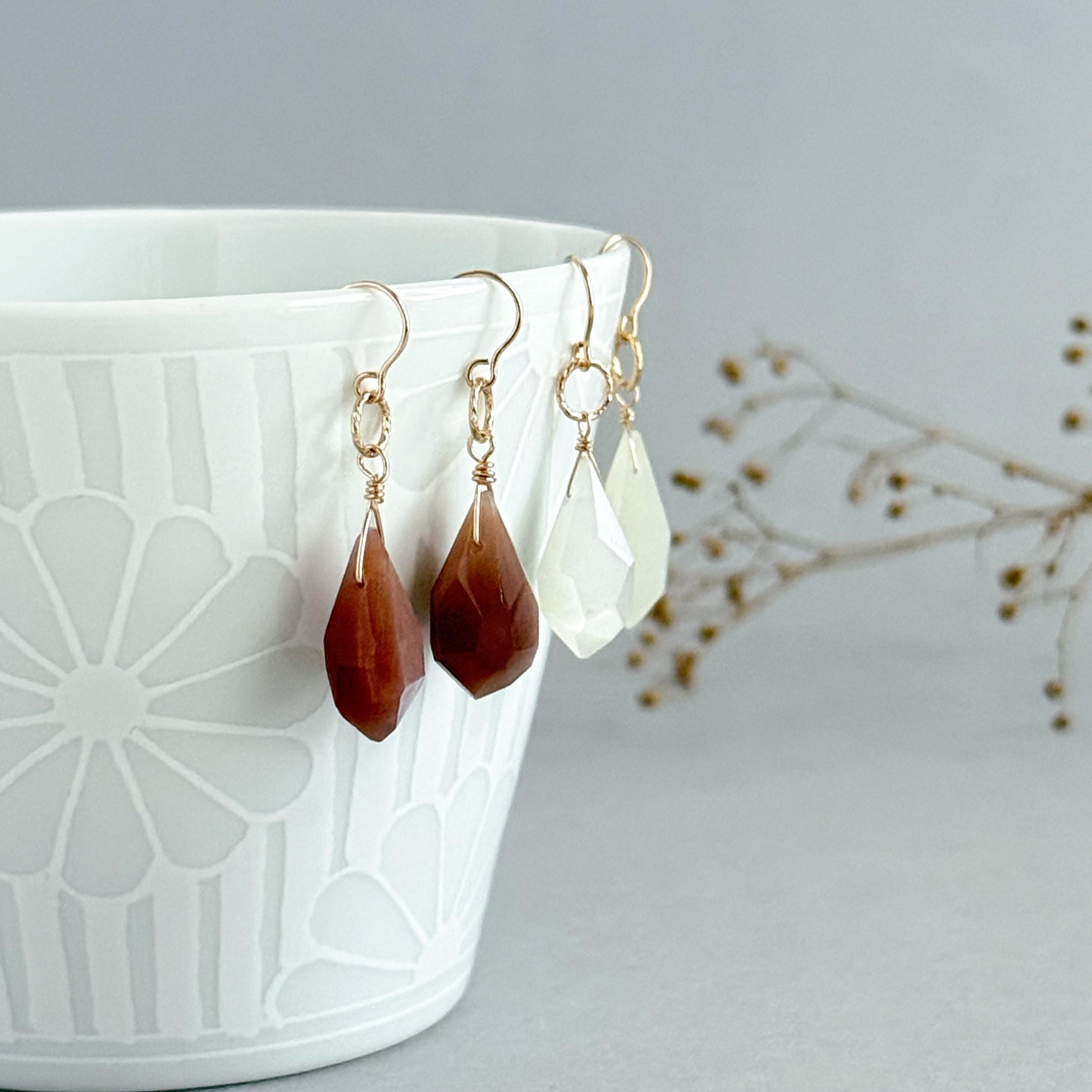 チョコ、ホワイトムーンストーンのシンプル一粒耳飾り